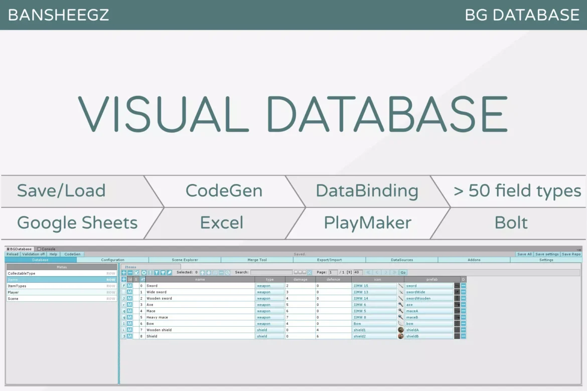 BG Database is a data editor for in-game data. Excel-like GUI. Sync with Excel/Google Sheets. Save/Load support. Unity assets fields. Code generation. Visual scripting tools integration.