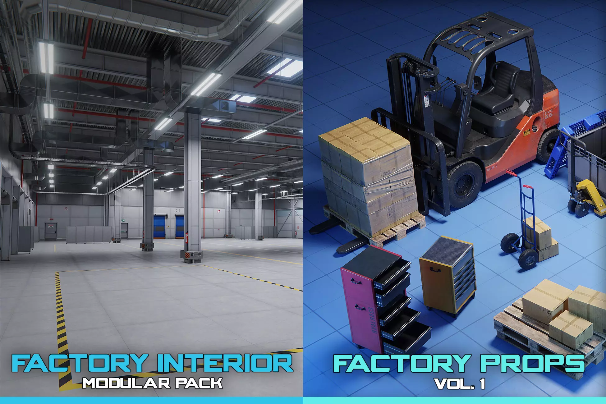 Bundle pack for your professional factory interior projects. Contained packages: Factory/Warehouse Props Vol. 1 Factory/Warehouse Interior Modular Pack